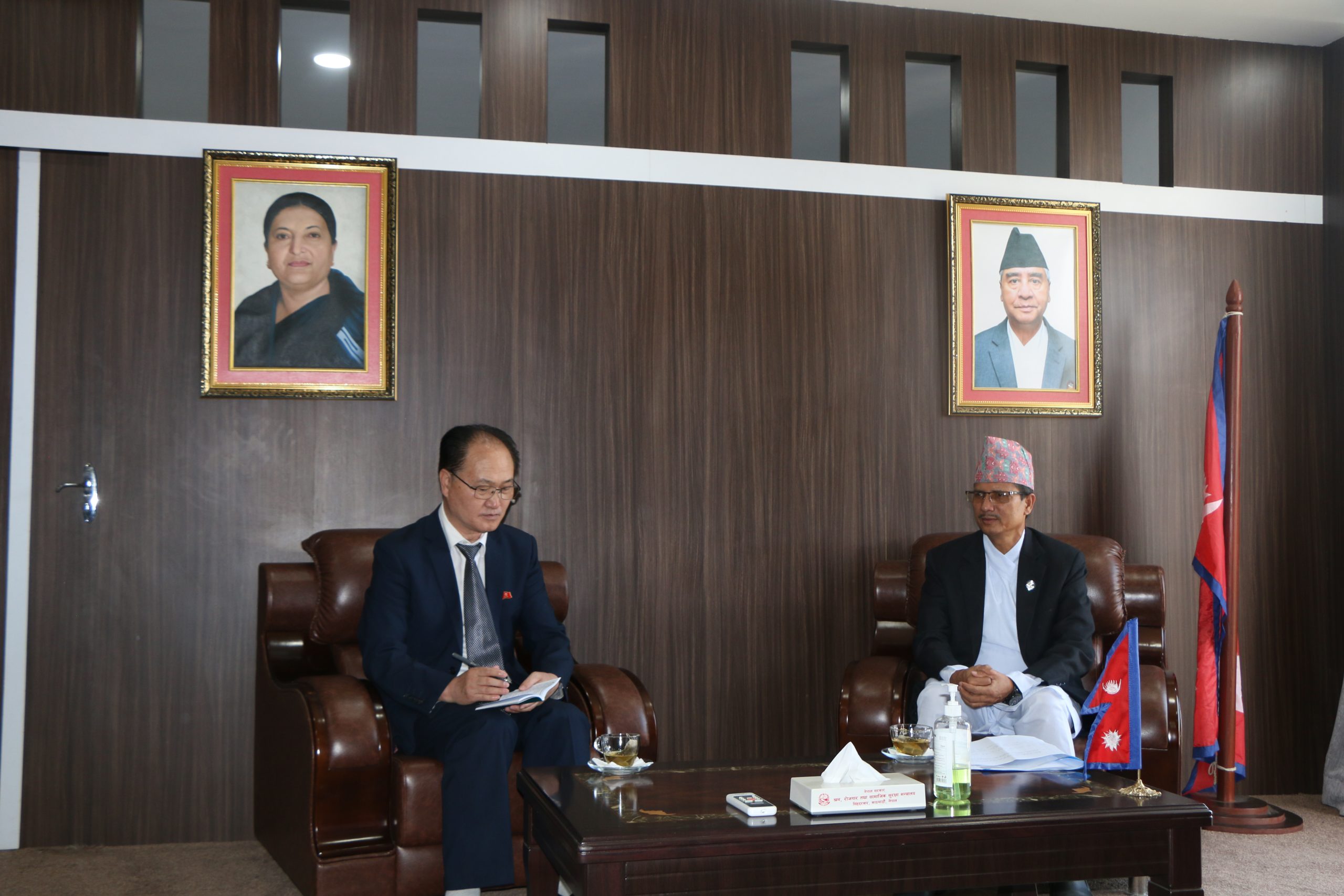 काठमाडौं।श्रम रोजगार तथा सामाजिक सुरक्षामन्त्री शेरबहादुर कुँवर र उत्तर कोरियाका राजदूत जो योङ मेनबीच शिष्टाचार भेटवार्ता भएको छ । राजदूत जो योङ मेन मन्त्री कुँवरलाई भेट्न बिहीबार मन्त्रालयमा पुगेका थिए । उनीहरूबीचको भेटमा दुई देशबीचको मैत्रीपूर्ण सम्बन्धका विषयमा छलफल भएको थियो । नेपाल र उत्तर कोरियाबीचको सम्बन्ध, आपसी सहकार्य र सहयोगलाई निरन्तरता दिने विषयमा छलफल भएको मन्त्रालयले जनाएको छ ।
