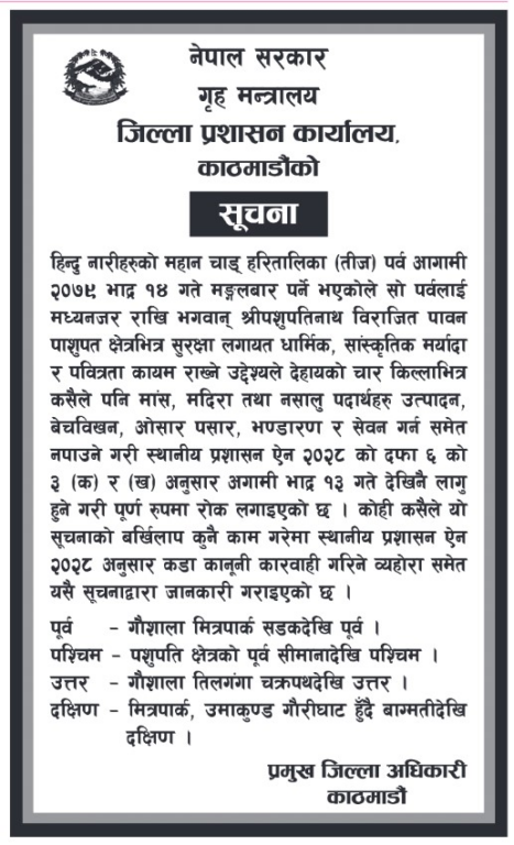 काठमाडौंका प्रमुख जिल्ला अधिकारी गोबिन्दप्रसाद रिजालले सार्वजनिक सूचना जारी गर्दै मदिरालगायत बिक्रीमा रोक लगाइएको छ। धार्मिक, सांस्कृतिक मर्यादा र पवित्रता कायम राख्न मदिराजन्य पदार्थको बिक्री वितरणमा रोक लगाइएको बताइएको छ।