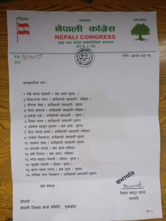प्रदेशसभाको प्रत्यक्षतर्फ नाम सिफारिस भएकाहरुमा नेपाली कांग्रेस नुवाकोटका निर्वतमान सभापति जगदीश्वरनरसिंह केसी, सभापति रमेश महत, पुर्व सभापति धुव्र अधिकारी, जिल्ला उपसभापति राजु थापा, प्रदेश सभापति बैकुण्ठ बहादुर पाण्डे, चोकराज शाक्य, हरिकृष्ण श्रेष्ठ र यादव प्रसाद नेपालको नाम सिफारिस भएको नेपाली कांग्रेस क्षेत्र नम्बर २ प्रदेश ९क० का सचिव अच्युत रिजालले बताए ।