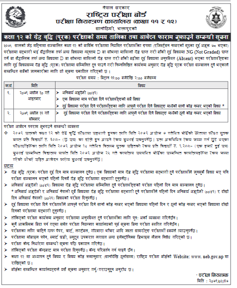 कार्यालयका अनुसार २०७९ सालको जेठ महिनामा सञ्चालित कक्षा १२ को वार्षिक परीक्षामा निममित परीक्षार्थीको रुपमा परीक्षामा सहभागी भइ सैद्धान्तिकतर्फ अन्य विषयमा न्यूनतम डी वा सोभन्दा माथिको ग्रेड प्राप्त गरी बाँकी दुई विषमा एनजी प्राप्त गर्न वा सद्धान्तिक तर्फ अन्य विषयमा डी वा सोभन्दा माथिल्लो ग्रेड प्राप्त गरी बाँकी बढीमा दुई विषयमा अनुपस्थित भएका परीक्षार्थीहरुका लागि दुई विषयसम्म ग्रेड वृद्धि परिक्षामा सहभाी हनु पाउने गरी परीक्षा सञ्चालन हुन लागेको हो ।