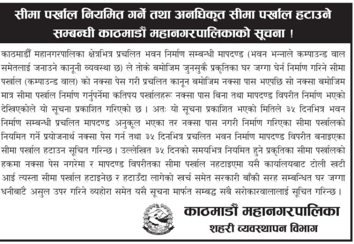 ‘काठमाडौं महानगगरपालिका क्षेत्रभित्र प्रचलित भवन निर्माण सम्बन्धी मापदण्ड (भवन भन्नाले कम्पाउन्ढ वाल समेतलाई जनाउने कानूनी व्यवस्था छ) ले तोके बमोजिम जुनसुकै प्रकृतिका घर जग्गा घेर्न निर्माण गरिने सीमा पर्खाल (कम्पाउन्ड) को नक्सा पेस गरी प्रचलित कानून बमोजिम नक्सा पास भएपछि सो नक्सा बमोजिम मात्र सीमा पर्खाल निर्माण गर्नुपर्नेमा कतिपय पर्खालहरु नक्सा पास बिना तथा मापदण्ड विपरीत निर्माण भएको देखिएकोले यो सूचना प्रकाशित गरिएको छ ।’ महानगरपालिकाले जारी गरेको सूचनामा भनिएको छ ।