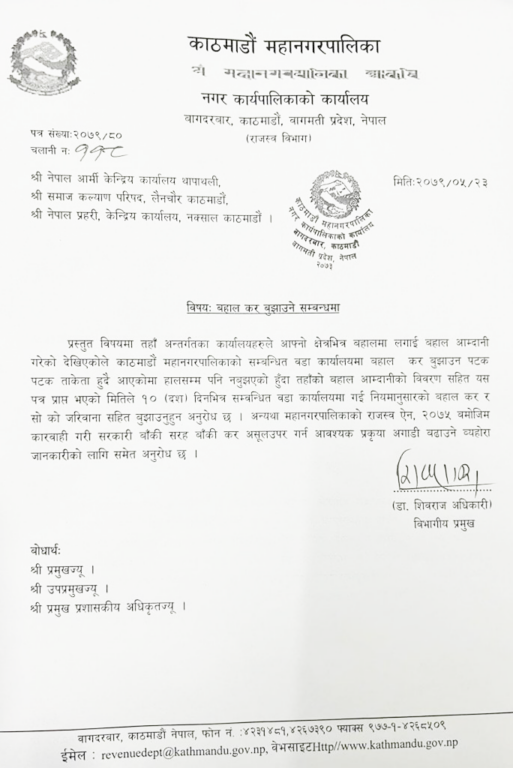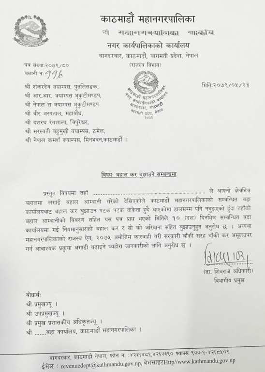 महानगरको राजस्व विभागले बिहीबार नेपाली सेना, समाज कल्याण परिषद्, शंकरदेव क्याम्पस, आरआर क्याम्पस, नेपाल ल क्याम्पस, वीर अस्पताल, दशरथ रंगशाला, सरस्वती बहुमुखी क्याम्पस र नेपाल कमर्श क्याम्पसलाई १० दिनभित्र सम्बन्धित् वडा कार्यालयमा गई निमानुसार बहाल कर र सो को जरिवानासहित बुझाउन पत्राचार गरेको हो ।