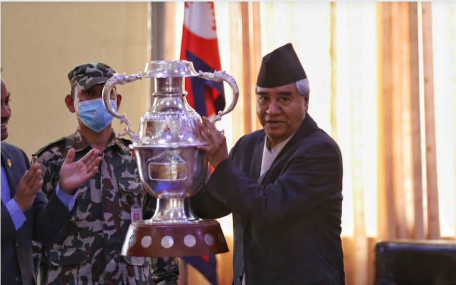 काठमाडौ ।प्रधानमन्त्री शेरबहादुर देउवाले नवौं राष्ट्रिय खेलकुदको रनिङ्ग ट्रफी सार्वजनिक गरेका छन् । प्रधानमन्त्रीको सरकारी निवास बालुवाटारमा एक कार्यक्रमकाबीच ट्रफी सार्वजनिक भएको हो । ट्रफी सार्वजनिक कार्यक्रममा युवा तथा खेलकुद मन्त्री र राखेप सदस्य सचिवको उपस्थित रहेको थियो ।