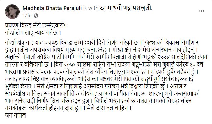 काठमाडौं । सत्ता गठबन्धनबाट गोरखाको निर्वाचन क्षेत्र नं. २ मा नेकपा (माओवादी केन्द्र) का अध्यक्ष पुष्पकमल दाहाल प्रचण्ड उम्मेदवार बन्ने भएपछि नेपाली कंग्रेसकी नेतृ माधवी भट्ट पराजुलीले उनको विरुद्ध उम्मेदवारी दिने घोषणा गरेकी छिन् । उनले सामाजिक सञ्जाल फेसबुकमा आफ्नो भनाइ राख्दै जिल्लाको विकास निर्माण र द्वन्द्वकालीन अपराधका विषय मुख्य मुद्दा बनाउने घोषणा गरेकी हुन् ।
