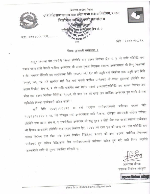 प्रतिनिधिसभा निर्वाचन क्षेत्र नं. २ का सहायक निर्वाचन अधिकृत घनश्याम गौतमले मंगलबार राति ११ बजेपछि जारी गरेको सूचनामा प्रतिनिधि सभा सदस्य तथा प्रदेशसभा सदस्य निर्वाचन निर्देशिका २०७९ को दफा १५ को खण्ड (ङ) वमोजिम उम्मेदवार हुन पाउने योग्यता नपुगेकाले तीनैजनाको उम्मेदवारी खारेज भएको हो ।
