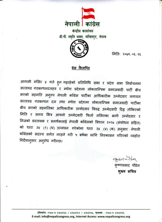 काठमाडौं । आगामी मंसिर ४ गते हुन लागि रहेको प्रतिनिधिसभा र प्रदेशसभाको निर्वाचनमा पार्टी नेतृत्वको नीति विपरीत बागी उम्मेदवारी दिने नेताहरुलाई नेपाली कांग्रेसले पाँच वर्षका लागि निष्कासन गरेको छ । सत्ता गठबन्धनको सहमति र पार्टीको निर्देशन विपरीत बागी उम्मेदवारी जारी राखेका नेताहरुलाई यस्तो कारवाही गरेको हो ।