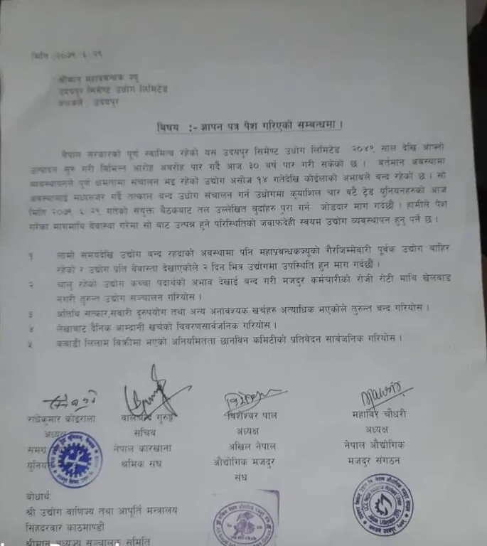 युनियनद्वारा उदयपुर सिमेन्ट उद्योग सञ्चालन गर्न माग
