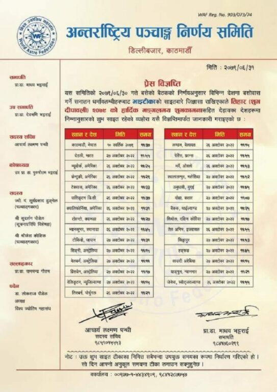 काठमाडौं ।अन्तर्राष्ट्रिय पञ्चाङ्ग निर्णय समितिले यस वर्षको तिहारको भाइटीकाको उत्तम साइत कात्तिक १० गते ११ बजेर ३७ मिनेटमा रहेको जनाएको छ ।