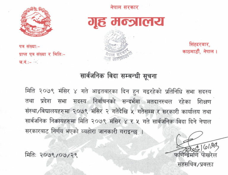 गृह मन्त्रालयका प्रवक्ता फणिन्द्रमणि पोखरेलले मंसिर ४ गते हुने प्रतिनिधि सभा र प्रदेशसभा निर्वाचनका लागि मतदानस्थल रहेका शिक्षण संस्थाहरू २ गतेदेखि ५ गतेसम्म तथा सरकारी कार्यालय र सार्वजनिक निकायहरु ४ र ५ गते बन्द हुने जानकारी दिए ।