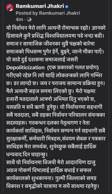 त्यसैले उनले गुल्मी क्षेत्र नम्बर २ बाट प्रतिनिधि सभा सदस्यमा निर्वाचित एमाले नेता गोकर्ण विष्टलाई पनि बधाई तथा शुभकामना दिएकी छिन् । नेत्रृ झाक्रीले निर्वाचितलाई वधाई र मतदातालाई धन्यवाद दिने क्रममा आफूले चुनावका बेला भोगेका आरोहअवरोहका बारेमा सामिाजक सञ्जालमार्फत यस्तो लेखेकी छिन् ।