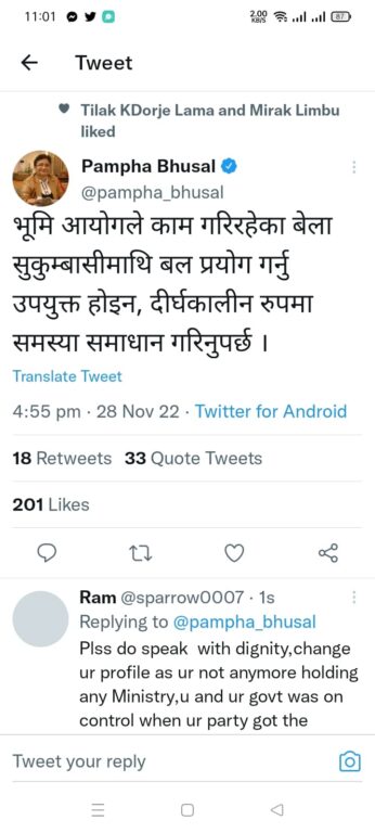 काठमाडौं । पुर्वउर्जामन्त्री पम्फा भुसालले सुकुम्बासीमाथि बल प्रयोग गर्नु उपयुक्त नभएको बताएकी छिन् । उनले सामाजिकसञ्जालामार्फत यस्तो बताएकी हुन् । उनले भूमि आयोगले काम गरिरहेको बेला उनीहरुमाथि बल प्रयोग गर्नु उचित नभएको बताइन् ।