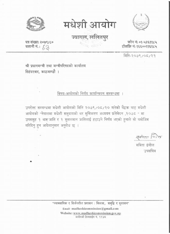 उक्त पत्रमा उल्लेख गरिएको छ, ‘मधेशी आयोगको मिति २०७२/०८/२० गतेको बैठक बाट मधेशी आयोगको ‘नेपालमा अध्ययन प्रतिवेदन २०७८’ मा उपसमुह १ थारू जाति र २ मुसलमान जातिलाई हटाउने निर्णय भएको हुनाले सो बमोजिम गरिदिनु हुन आदेशानुसार अनुरोध छ ।’