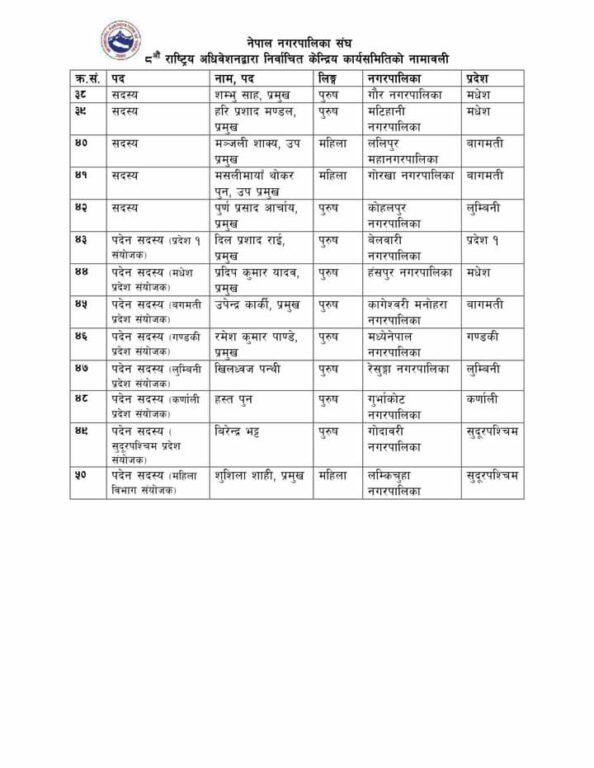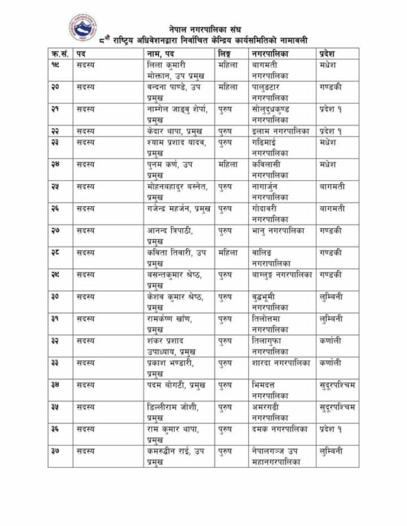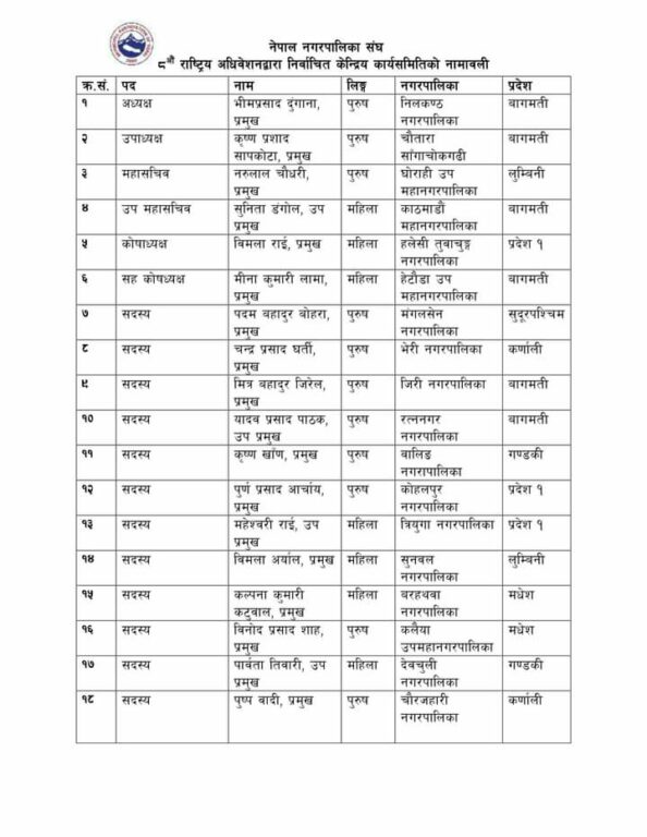 अधिवेशनमा गाउँपालिकाको जस्तै नगरपालिका राष्ट्रिय संघको पनि अध्यक्षदेखि अन्य पदाधिकारीहरु दलीय भागबन्डाको आधारमा कार्यसमिति चयन गरिएको छ । निर्वाचित कार्यसमितिमा पदाधिकारीदेखि सदस्यसम्मको नाम यस प्रकार छन् :