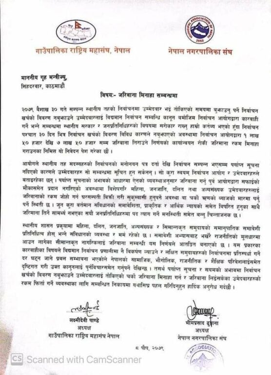 स्थानीय उम्मेदवारहरुले विभिन्न कारणवस खर्चको विवरण बुझाउन ढिलाइ भएपछि आयोगले जरिवाना तिर्न तागेता गरेको थियो । तर, आयोगले तोकेको जरिवाना महिला, दलित, उत्पीडित, अल्पसंख्यक, पीछडा वर्गलगायत सबैले तिर्न सक्ने अवस्था नभएको र तिर्नका लागि आफ्नो घरजेथा नै बेच्नुपर्ने अवस्था भएकाले सो जरिवाना मिनाह गर्न गाउँपालिका राष्ट्रिय महासंघ र नगरपालिका संघले विज्ञप्ति जारी गर्दै आग्रह गरेका छन् ।