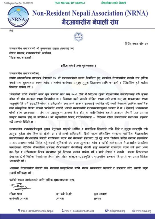 एनआरएनले दियो प्रधानमन्त्री प्रचण्डलाई बधाई