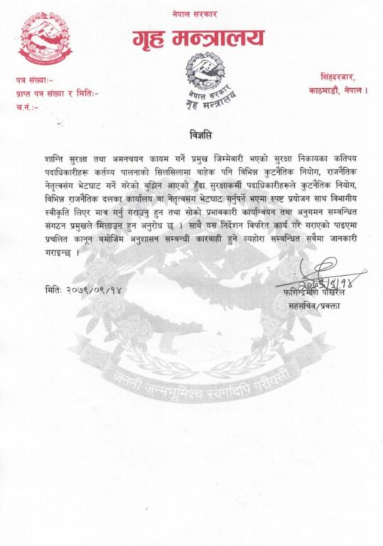 गृहमन्त्रालले जारी गरेको विज्ञप्ति