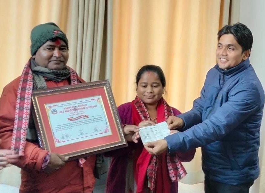 चितवनको कालिका नगरपालिका–४ स्थायी ठेगाना भई हाल आँबुखैरेनी गाउँपालिका–५ बस्ने विश्वकर्मालाई गाउँपालिकाले नगद रु २० हजारसहित सम्मानपत्र प्रदान गरेको हो । परम्परागत आरनलाई आधुनिकीकरण गरी घरेलु सीपलाई उद्यममा विकास गर्न सहयोग पुर्याएबापत विश्वकर्मालाई सम्मान गरिएको गाउँपालिकाका अध्यक्ष शुक्र चुमानले बताए । अध्यक्ष चुमानले भने, “लामो समयदेखि आरन व्यवसाय गर्दै आएका उनले आधुनिकीकरणमा पु¥याएको योगदानस्वरुप प्रोत्साहन गर्न नगदसहित सम्मान गरेका हौँ ।”