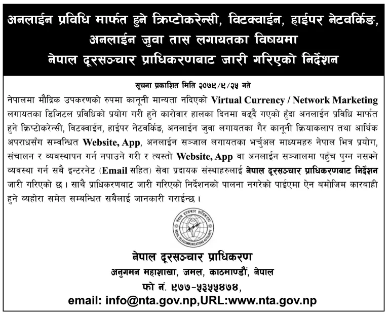 काठमाडौँ । नेपालमा अनलाइन जुवा र क्रिप्टोकरेन्सीका वेबसाइट र एप नेपालमा बन्द गर्न नेपाल दूरसञ्चार प्राधिकरणको अनुगमन महाशाखाले निर्देशन दिएको छ । मौद्रिक उपकरणको रूपमा कानुनी मान्यता नदिएको भर्चुअल करेन्सी र नेटवर्क मार्केटिङ लगायतका डिजिटल प्रविधिको प्रयोग गरी हुने कारोबार बन्द गर्न भनेको हो ।