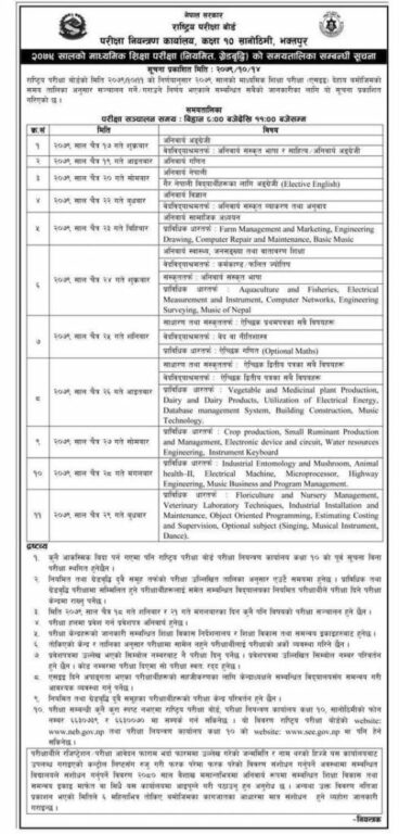 बोर्डले चैत १७ गतेबाट सञ्चालन हुने एसइईको परीक्षा आज (शनीबार) तालिका सार्वजनिक गरेको हो ।