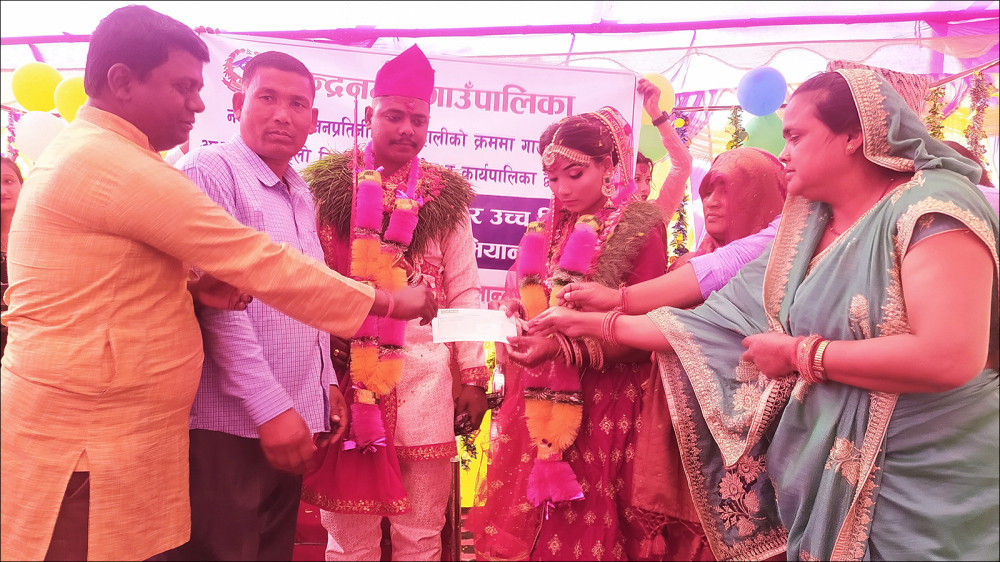 सर्लाही । सर्लाहीको चन्द्रनगर गाउँपालिकाले कक्षा १२ को अध्ययन पूरा गरी २० वर्ष पार गरी विवाह गर्ने बेहुलीलाई ५० हजार रुपैयाँ नगद हस्तान्तर गरेको छ । गाउँपालिका अध्यक्ष राजकुमार महतोले जयपालसिंह दनुवारकी २१ वर्षीया छोरी लक्ष्मीसिंह दनुवारलाई बिहीबार विवाह मण्डपमै पुगेर ५० हजार रुपैयाँ नगदले सम्मान गरेका हुन् ।