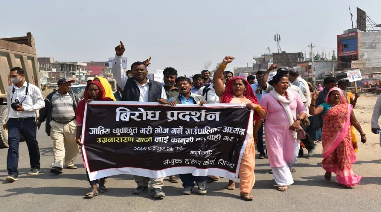 काठमाडौं । भगवानपुर गाउँपालिका अध्यक्ष उग्रनारायण यादवलाई कारबाहीको माग गर्दै मोर्चाले गोलबजारमा प्रदर्शन गरेको छ । अध्यक्ष यादवले दलित समुदायमाथि अपमानित व्यहार गरेको भन्दै उनी विरुद्ध प्रदर्शन भएको हो ।