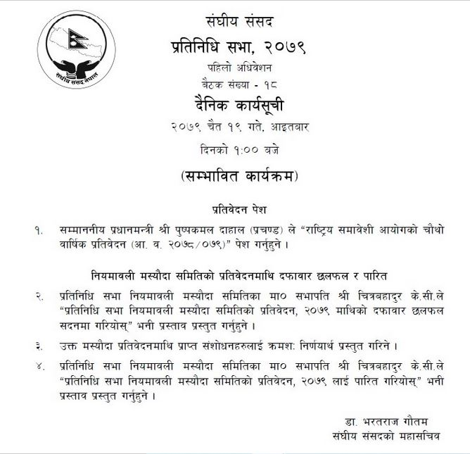 बैठकमा प्रधानमन्त्री पुष्पकमल दाहाल ‘प्रचण्ड’ ले “राष्ट्रिय समावेशी आयोगको चौथो वार्षिक प्रतिवेदन (आ.व. २०७८र०७९०’ पेस गर्ने कार्यसूची रहेको संघीय संसद् सचिवालयले जनाएको छ ।