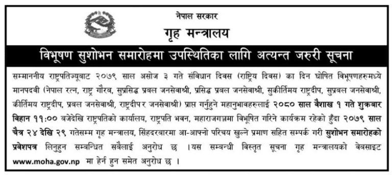 शीतलनिवासमा हुने विभूषण समारोहमा सहभागी हुन प्रवेशपत्र आवश्यक रहेको गृह मन्त्रालयले सूचना प्रकाशन गरी जानकारी दिएको छ।
