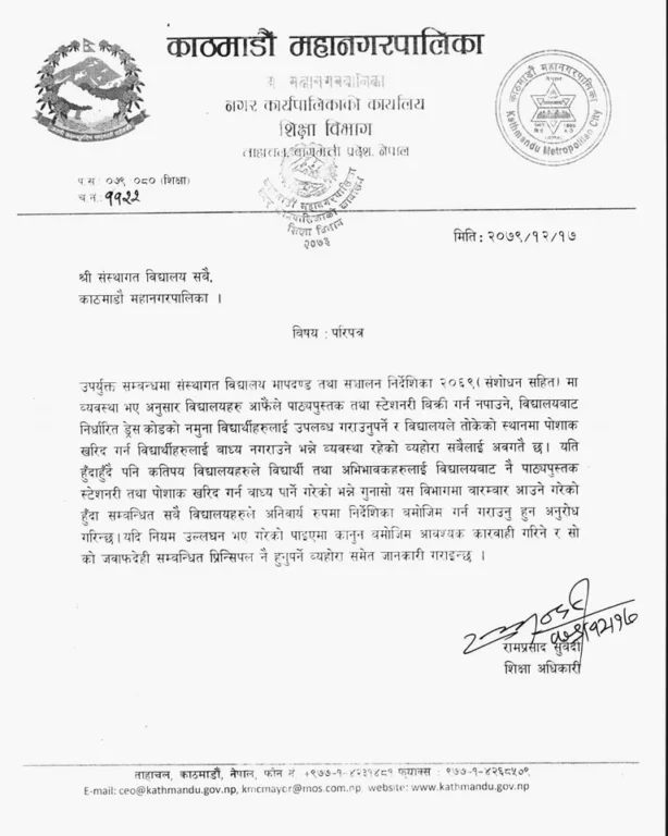 ‘विद्यालय आफैंले किताब बेच्ने गरेको र पोसाकसमेत सम्बन्धित ठाउँबाट नै किन्नु भनेर अभिभावकलाई बाध्य गराएको गुनासो पटक(पटक आइरहेकाले महानगरका मेयर शाहले विज्ञप्ती जारी गर्दै यस्तो बताएका हुन् ।
