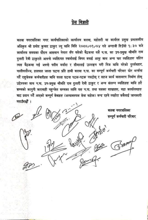 उपप्रमुख र सग्लन व्यक्तिहरुलाई कारबाही नभएसम्म वडासम्मका सम्पूर्ण काम ठप्प बनाउने पनि उनीहरूले घोषणा गरेका छन् ।