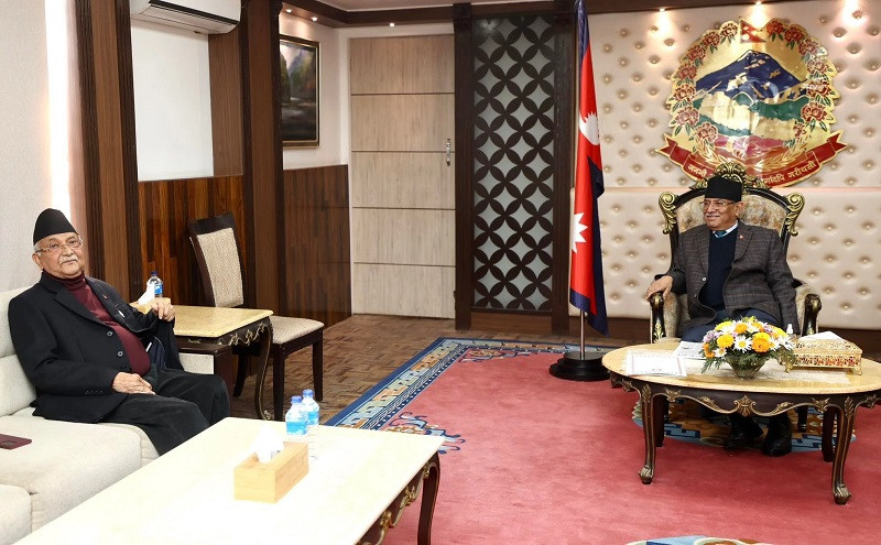 काठमाडौं । प्रधानमन्त्री पुष्पकमल दाहाल प्रचण्ड र नेकपा (एमाले)का अध्यक्ष केपी शर्मा ओलीबीच भेटवार्ता भएको भएको छ । प्रधानमन्त्री प्रचण्डको सचिवालयले दिएको जानकारी अनुसार दुई नेताबीच सिंहदरबारमा भेट भएको हो ।