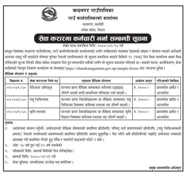 सर्लाही । सर्लाहीको चन्द्रनगर गाउँपालिकाले करार सेवाका लागि विभिन्न पदमा कर्मचारी आवश्यकता सम्बन्धी सूचना प्रकाशित गरेको छ ।