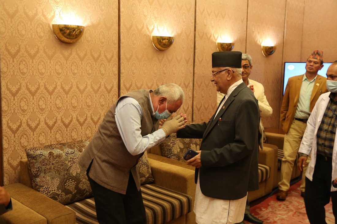 जवाफमा एमाले अध्यक्ष ओलीले भने, ‘तपाईं फर्केर आउनुहुन्छ भन्ने विश्वास थियो । निको भएर आएपछि भेट भयो । खुसी लागेको छ ।’