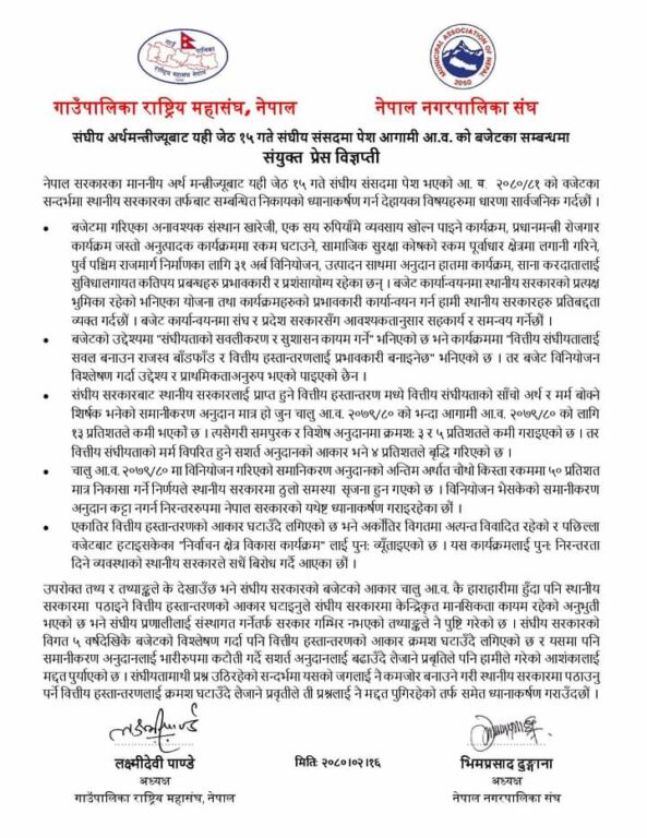 काठमाडौं । गाउँपालिका राष्ट्रिय महासंघ र नगरपालिका संघले गत जेठ १५ गते सार्वजनिक आब २०८०÷८१ बजेटका सन्दर्भमा असन्तुष्टि जनाउँदै संयुक्त प्रेस विज्ञप्ति जारी गरेका छन् । अर्थमन्त्री डा। प्रकाशशरण महतद्वारा सार्वजतिक बजेटमा धेरै सकरात्मक विषय समेटिएकाले स्वागतयोग्य रहेको विज्ञाप्तिमा जनाइएको छ ।