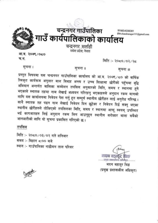 सर्लाही । सर्लाहीको चन्द्रनगर गाउँपालिकाले बालविवाह अन्त्य र उच्च शिक्षामा किशोरीको पहुँच वृद्धि अभियान अन्तर्गत बालिका सम्मेलन गर्ने भएको छ ।