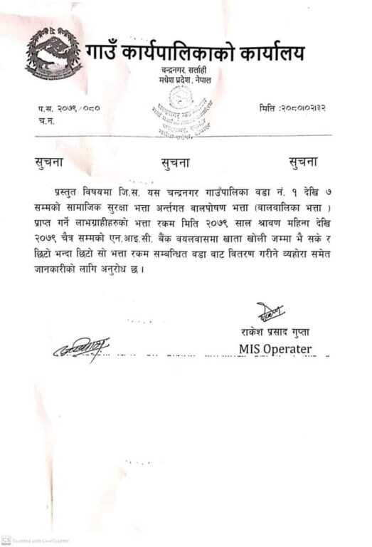 सर्लाही । सर्लाहीको चन्द्रनगर गाउँपालिकाले वडा नम्बर १ देखि ७ सम्मको सामाजिक सुरक्षा भत्ताअन्तर्गतको बालपोषण भत्ता (बालबालिका भत्ता) लाभग्राहीलाई छिटोछरितो तारिकाले वितरण गर्ने बताएको छ ।