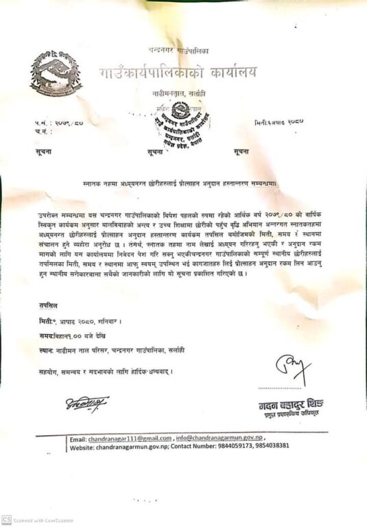 सर्लाही । सर्लाहीको चन्द्रनगर गाउँपालिकाले बालविवाह अन्त्य र छोरीहरुमा शिक्षाको पहुँच वृद्धि गर्ने अभियान अन्तर्गत स्नातक तहमा अध्ययनरत छोरीहरुलाई प्रोत्साहन अनुदान रकम असार ९ गते शनिबार हस्तान्तरण गर्ने भएको छ ।