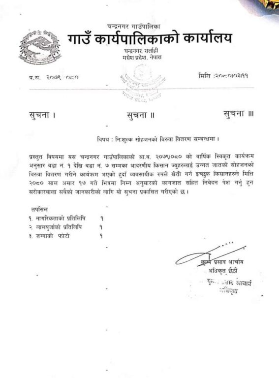 सो उन्नत जातका सोहजन वितरण कार्यक्रम आगामी असार १७ गते रहेको गाउँपालिकाले जनाएको छ । उक्त उन्नत जातका विरुण लिन इच्छुक किसानले गाउँपालिकाद्वारा जारी सूचनामा भनिएअनुसारको कागजातसहित आवेदन पेश गर्न जारी सूचनामा भनिएको छ ।