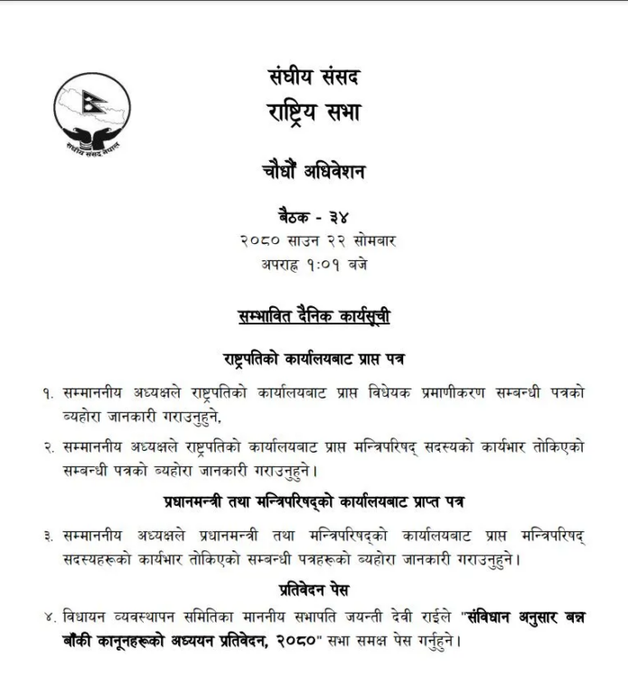 आजको बैठकमा राष्ट्रपति कार्यालयबाट प्राप्त कार्यभार तोकिएको र विधेयक प्रमाणीकरण सबन्धी पत्रहरूको ब्यहोरा पढेर सुनाउने तथा प्रधानमन्त्री तथा मन्त्रिपरिषद् कार्यालयबाट प्राप्त कार्यभार तोकिएको पत्र पढेर सुनाइनेछ ।