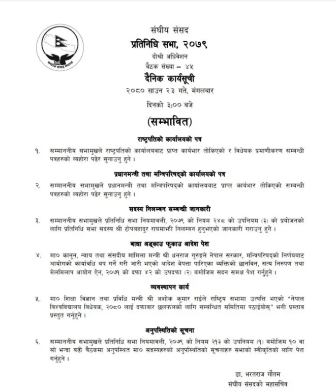 यसैगरी, शिक्षा मन्त्री अशोककुमाार राईले राष्ट्रियसभामा उत्पत्ति भएको नेपाल विश्वविद्यालय विधेयक २०८० लाई दफावार छलफलका लागि सम्बन्धित समितिमा पठाउने प्रस्ताव पेश गर्नेछन् भने सभामुखले १० वा सो भन्दा बडी बैठकमा अनुपस्थित सांसदहरूको सूचनाहरू सभाको स्वीकृतिका लागि पेश गर्ने कार्यसूची रहेको छ ।