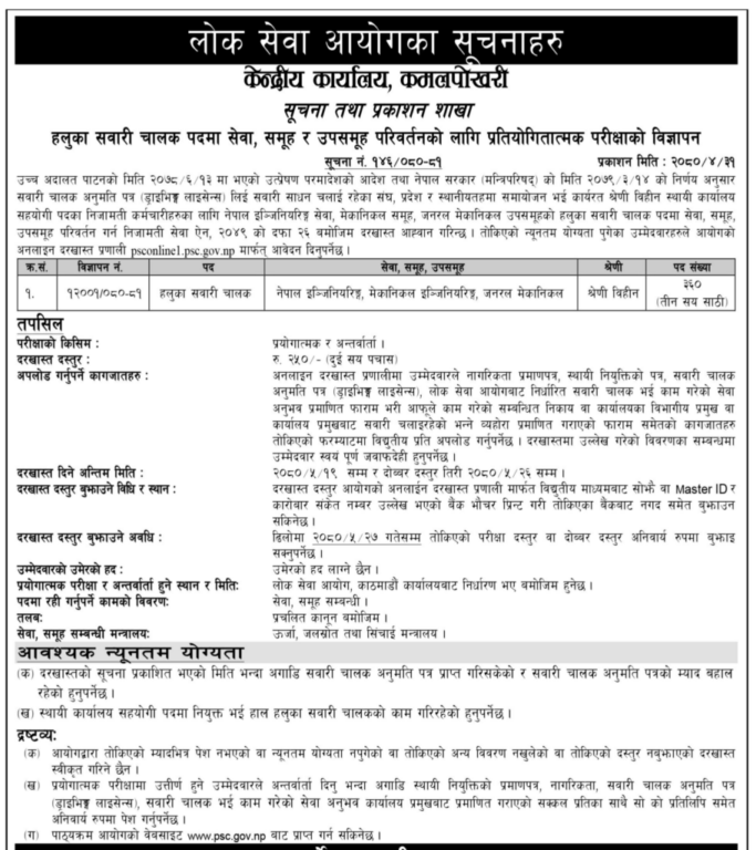 काठमाडौं । लोक सेवा आयोगले ३६० जना हलुका सवारी चालकका लागि दरखास्त आव्हान गरेको छ ।