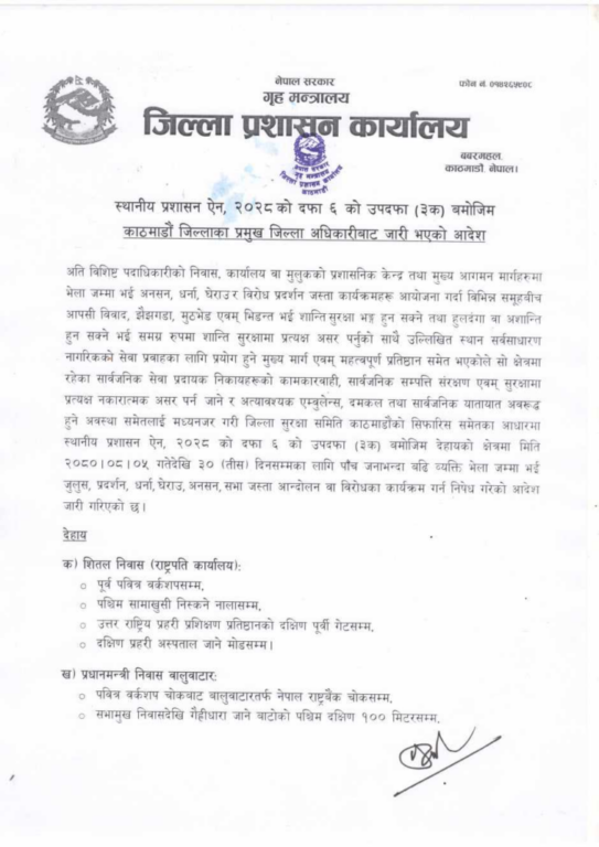 काठमाडौंका प्रमुख जिल्ला अधिकारीले राष्ट्रपति कार्यालयको पूर्व पवित्र वर्कशपसम्म, पश्चिम सामाखुसी निस्कने नाला, उत्तर प्रहरी प्रशिक्षण प्रतिष्ठानको पूर्वी गेट र दक्षिणमा प्रहरी अस्पताल जाने मोडसम्म निषेधको आदेश जारी गरेको हो ।यस्तै बालुवाटारमा पवित्र वर्कशप चोकबाट बालुवाटारतर्फ नेपाल राष्ट्र बैंक चोक र सभामुखदेखि गैह्रीधारा जाने बाटोको पश्चिम दक्षिण १०० मिटरसम्म पाँच जनाभन्दा बढी भेला हुने नदिने आदेश जारी भएको हो ।मंसिर ५ गतेबाट लागू हुनेगरी आगामी ३० दिनसम्मका लागि यी स्थानमा जुलुस, प्रदर्शन, धर्ना, घेराउ, अनसन र सभाजस्ता आन्दोलन वा विरोधका कार्यक्रम गर्न निषेध गरिएको प्रशासनले जारी गरेको विज्ञप्तिमा उल्लेख छ ।