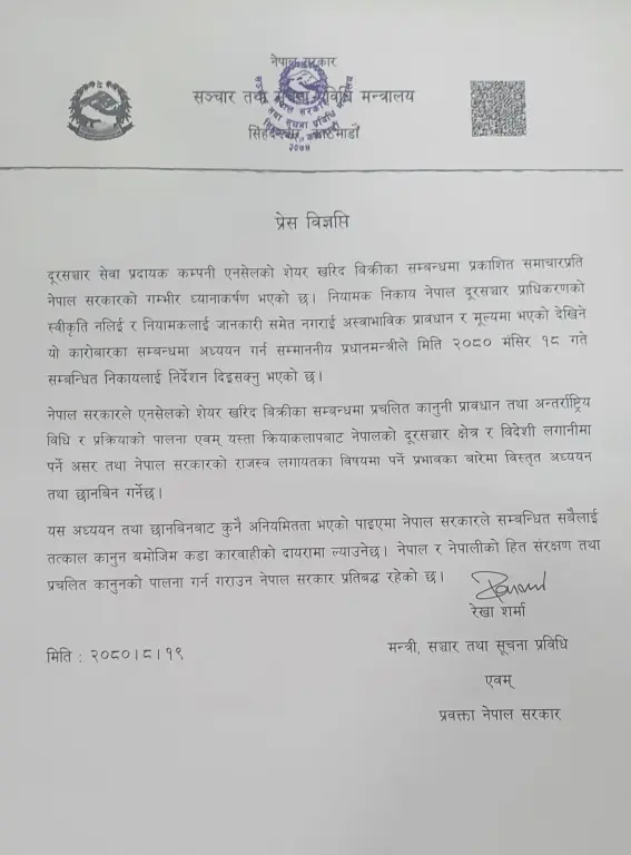 सञ्चार तथा सूचना प्रविधिमन्त्री रेखा शर्माले मंगलबार विज्ञप्ति जारी गर्दै नेपाली र नेपालीको हित संरक्षण गर्न तथा प्रचलित कानुनको पालना गर्नरगराउन सरकार प्रतिबद्ध रहेको बताएकी हुन् ।सरकारले एनसेलको शेयर खरिदबिक्रीका सम्बन्धमा प्रचलित कानुनी प्रावधान तथा अन्तर्राष्ट्रिय विधि र प्रक्रियाको पालना एवं यस्ता क्रियाकलापबाट नेपालको दूरसञ्चार क्षेत्र र विदेशी लगानीमा पर्ने असर तथा सरकारको राजस्वलगायत विषयमा पर्ने प्रभावका बारेमा विस्तृत अध्ययन तथा छानबिन गर्ने मन्त्री शर्माले बताइन् ।