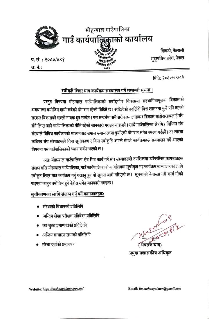 मोहन्याल गाउँपालिका क्षेत्र भित्र कार्य गर्ने संघ संस्थाहरूले स्वीकृति लिएर मात्र कार्यक्रमहरू संचालन गर्न निर्देशन