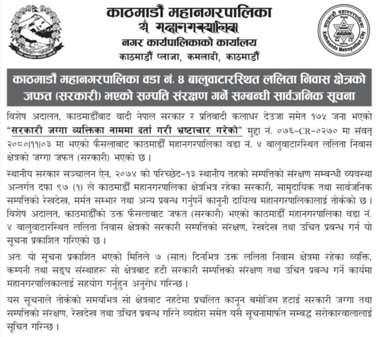‘विशेष अदालत, काठमाडौंबाट वादी नेपाल सरकार र प्रतिवादी कलाधर देउजा समेत १७५ जना भएको “सरकारी जग्गा व्यक्तिका नाममा दर्ता गरी भ्रष्टाचार गरेको” मुद्दामा २०८० फागुन ३ गते भएको फैसलाबाट काठमाडौं महानगरपालिका वडा नं.४ बालुवाटारस्थित ललिता निवास क्षेत्रको जग्गा जफत (सरकारी) भएको छ ।’ महानगरद्वारा जारी सूचनामा उल्लेख छ ।