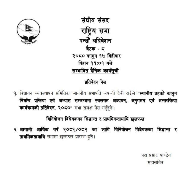 साथै, आगामी आर्थिक बर्ष २०८१/८२ का लागि बिनियोजन विधेयकका सिद्दान्त र प्राथमिकता माथि सभामा छलफल हुने महासचिव पदमप्रसाद पाण्डेयले जारी गरेको सम्भावित कार्यसूचीमा उल्लेख गरिएको छ ।