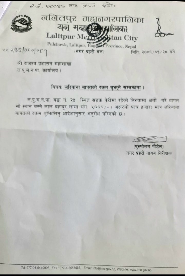 काठमाडौं । ललितपुर महानगरपालिका वडा नम्बर २५ स्थित सडकपेटिको बिरुवालाई काटेर बाख्रालाई खुवाउदै गरेका सोही वडाका लाल बहादुर लामालाई ५००० जरिवाना गरेको ललितपुर नगरप्रहरीले जानकारी गराए ।