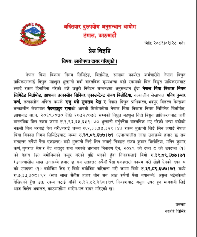 काठमाडौं । अख्तियार दुरूपयोग अनुसन्धान आयोगले झापाको नेपाल चिया विकास निगम लिमिटेड, बिर्तामोडका तत्कालीन सिनियर एकाउन्टेन्ट संजय बिलोटियासहित ४ जनाविरूद्ध भ्रष्टाचार मुद्दा दायर गरेको छ ।