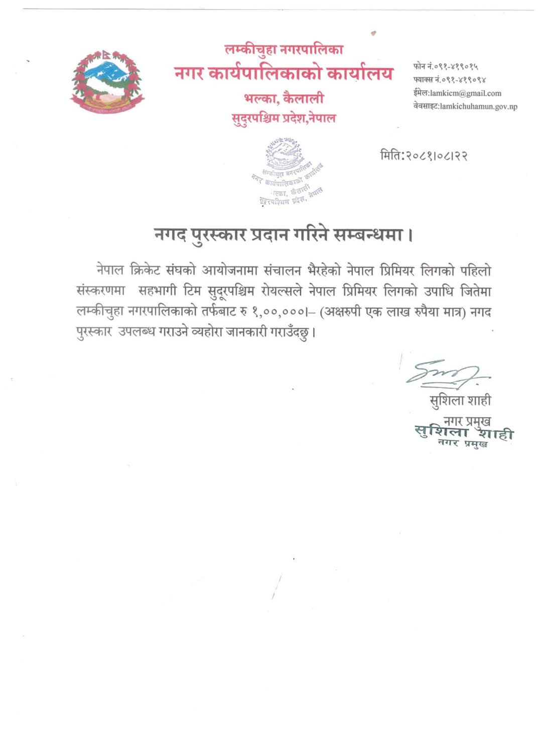 लम्किचुहा नगर प्रमुख सुशिला शाही खेलप्रेमि मेयरका रुपमा समेत चिनिने गर्छिन ।