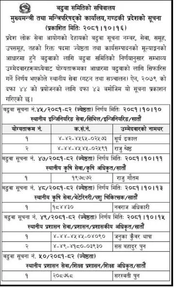 बढुवा समितिको १०, ११, १३, १५ गते बसेको बैठकमा स्थानीय इन्जिनियरिङ सेवा अन्तर्गत सिभिल इन्जिनियरिङ र स्थानीय कृषि सेवाका, कृषि अधिकृत/भेटेरिनरी/पशु चिकित्सक/स्थानीय प्रशासन सेवा अन्तर्गत प्रशासन/प्रशासकीय/शिक्षा प्रशासन समूहका पदमा बढुवा गर्ने निर्णय गरेको हो ।