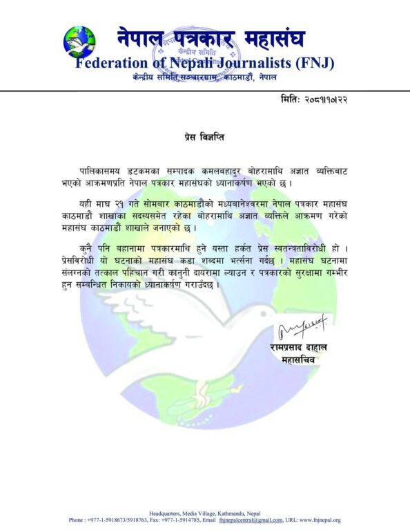 प्रकाशित समाचारप्रति चित्त नबुझे नेपाल प्रेस काउन्सिलमा उजुरी गर्न सकिने प्रवाधान हुदाहुदै विभिन्न बाहनामा भएको आक्रमण प्रति गम्भीर आपत्ति प्रकट गर्दै आक्रमणकारीलाई कारवाहीको दायरामा ल्याउन यस शाखा सम्वन्धित पक्षको ध्यानाकर्षण गराउँदछ ।